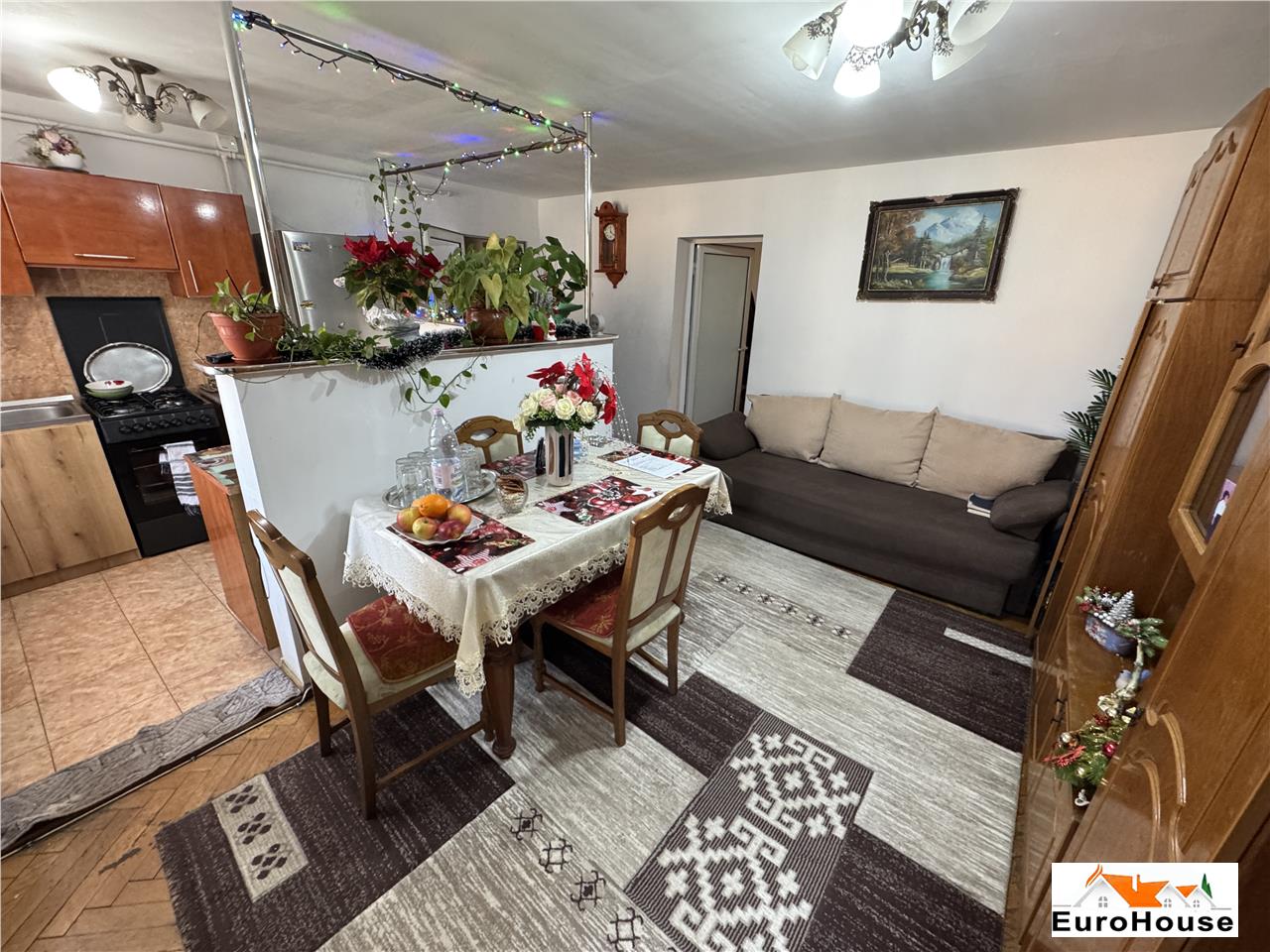 Living open space cu bucătăria, spațiu aerisit, perfect pentru relaxare și socializare